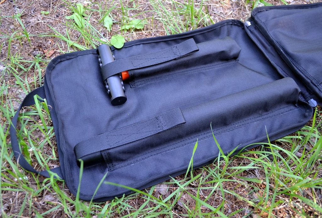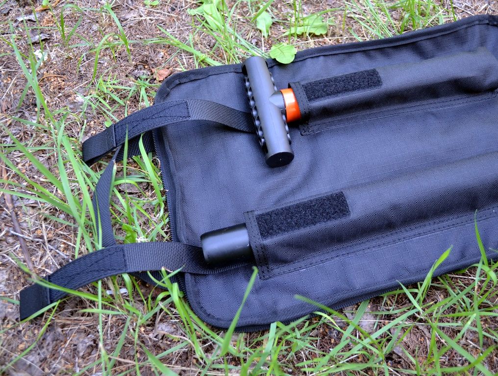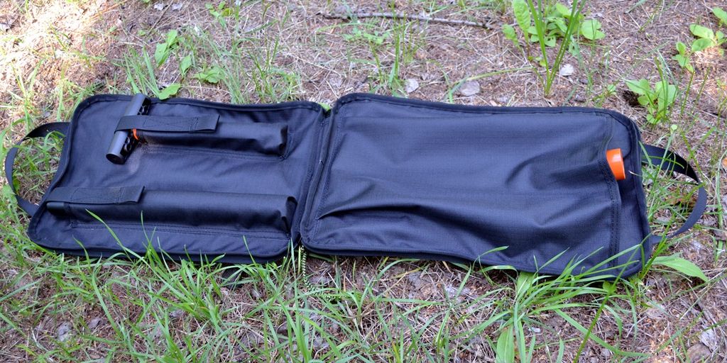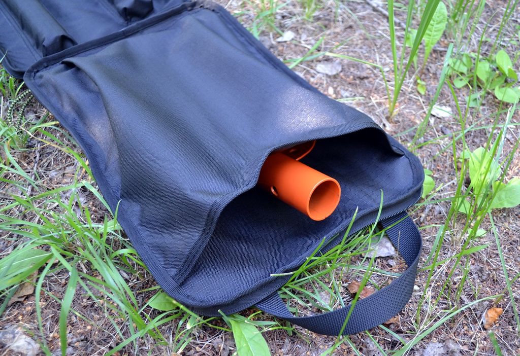 Чехол на молнии с двумя бегунками - раскрывается,как книжка и за счет этого - легкий доступ к трем частям лопаты.Имеет две ручки для переноски.