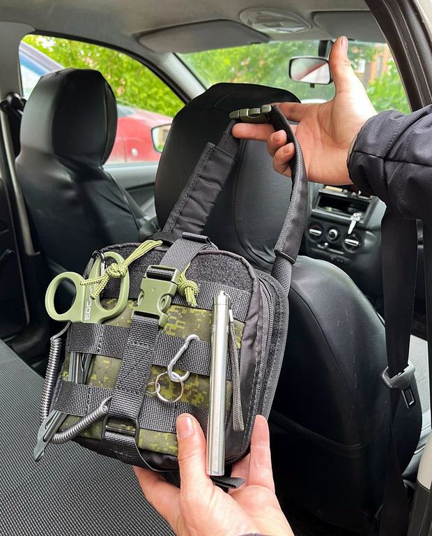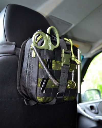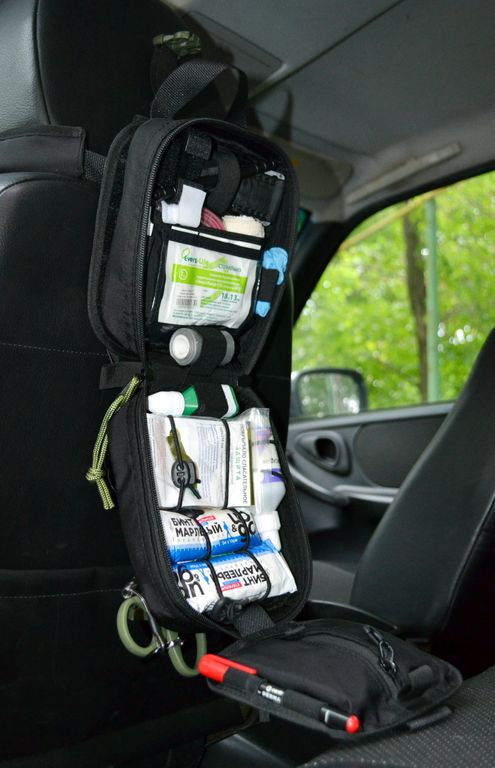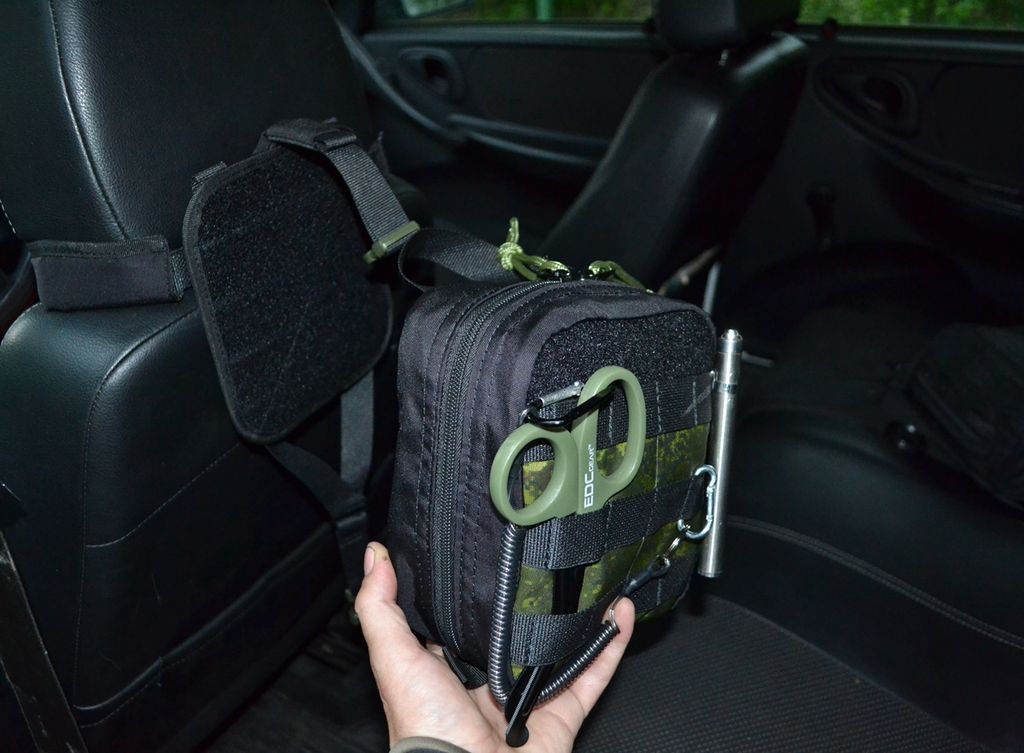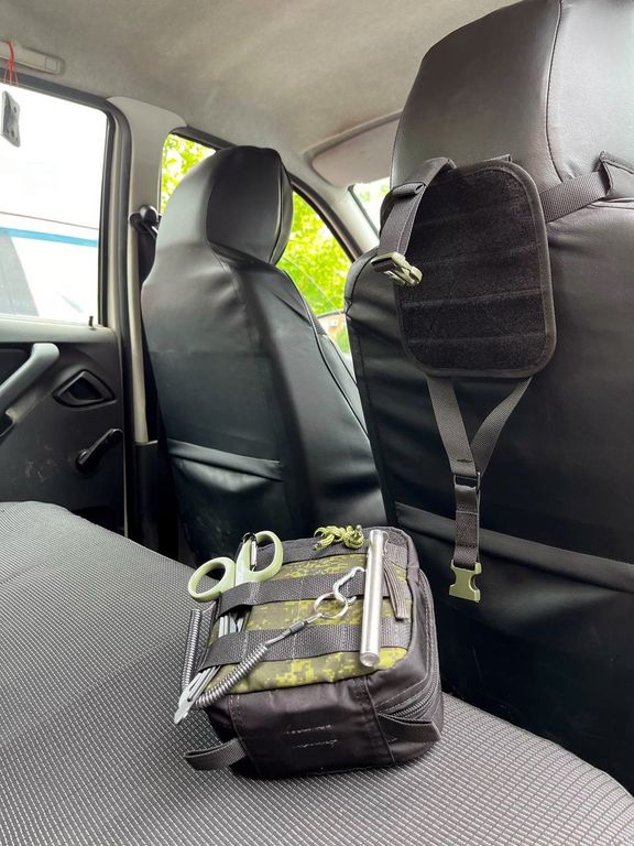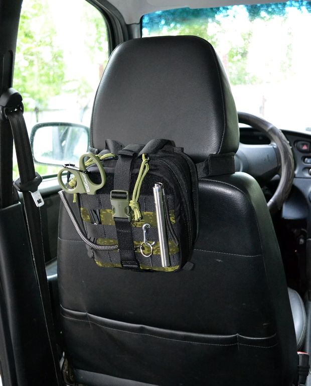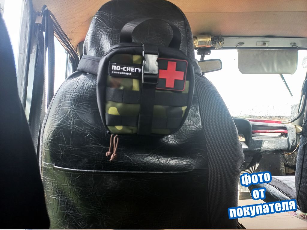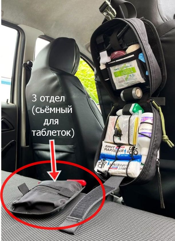 Наша аптечка служит для размещения всех необходимых медикаментов для медицинской помощи на дороге или в быту.Особенностью данной аптечки служит разделение внутренней организации на три части.Это поможет быстро найти и извлечь необходимое,тем самым быстрее начать оказывать помощь пострадавшему.Аптечка крепиться на сиденье стропой между подголовником и сиденьем.Аптечка - отрывная.Чтобы быстро отделить аптечку,нужно расстегнуть фастекс и "оторвать" от платформы с липучкой.