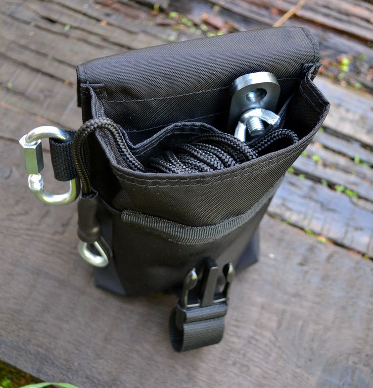 - чехол,сшитый из ткани КОРДОН 500 (100% нейлон, производства Россия).Чехол имеет два отделения: одно отделение для самой кошки,в разложенном виде и второго отделения - для шнура,чтобы не происходило запутывания обоих при перевозке.Карабин закрепляется на отдельной стропе,чтобы удобно и быстро прицепить к разборной кошке.